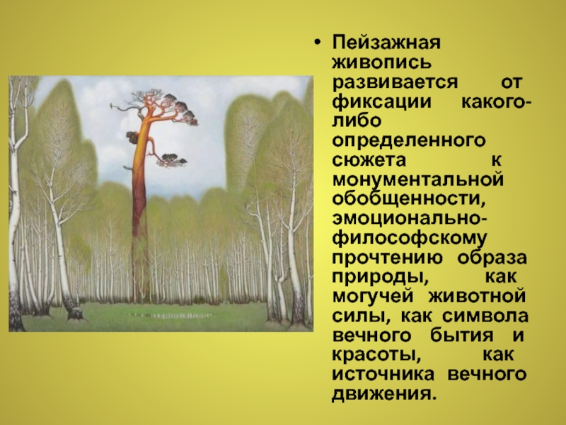 Слайд 22Пейзажная живопись развивается от фиксации какого-либо определенного сюжета к монументальной обобщенности,