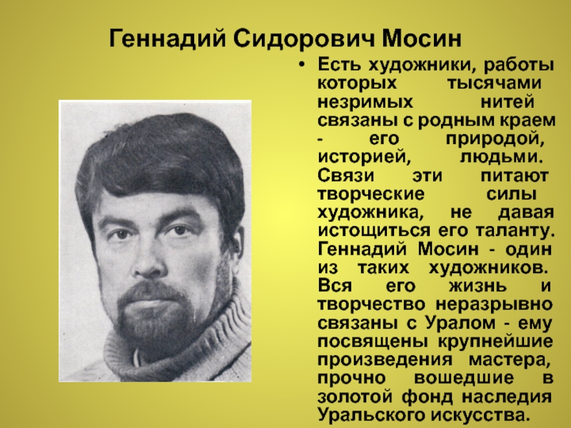 родным краем - его природой, историей, людьми. Связи эти питают творческие силы художника, не давая истощиться его таланту. Геннадий Мосин - один из таких художников. Вся его жизнь и творчество неразрывно связаны с Уралом - ему посвящены крупнейшие произведения мастера, прочно вошедшие в золотой фонд наследия Уральского искусства.