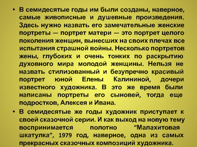 В семидесятые же годы художник приступает к своей сказочной серии. И как выход на новую тему воспринимается полотно “Малахитовая шкатулка”, 1979 год, наверное, одна из самых прекрасных сказочных композиций художника.
