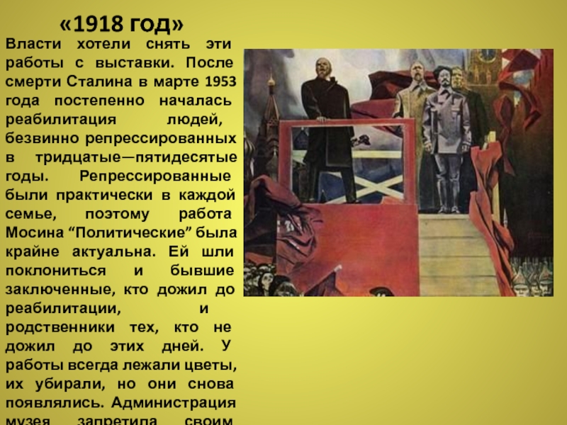 в марте 1953 года постепенно началась реабилитация людей, безвинно репрессированных в тридцатые—пятидесятые годы. Репрессированные были практически в каждой семье, поэтому работа Мосина “Политические” была крайне актуальна. Ей шли поклониться и бывшие заключенные, кто дожил до реабилитации, и родственники тех, кто не дожил до этих дней. У работы всегда лежали цветы, их убирали, но они снова появлялись. Администрация музея запретила своим сотрудникам говорить об этой картине.