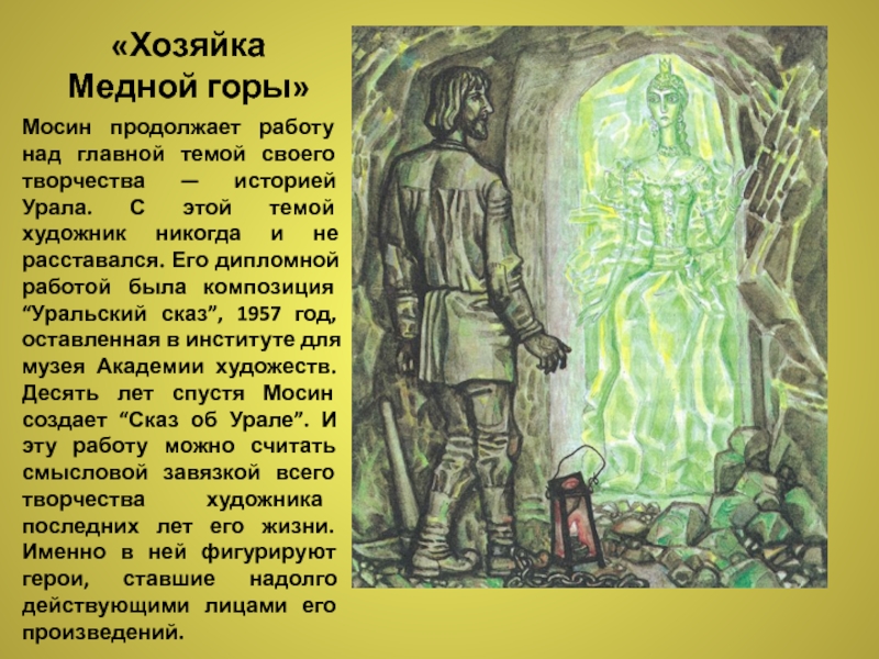историей Урала. С этой темой художник никогда и не расставался. Его дипломной работой была композиция “Уральский сказ”, 1957 год, оставленная в институте для музея Академии художеств. Десять лет спустя Мосин создает “Сказ об Урале”. И эту работу можно считать смысловой завязкой всего творчества художника последних лет его жизни. Именно в ней фигурируют герои, ставшие надолго действующими лицами его произведений.