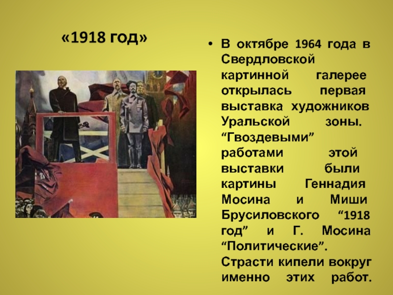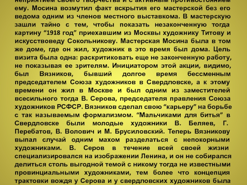 и с активным противостоянием ему. Мосина возмутил факт вскрытия его мастерской без его ведома одним из членов местного выставкома. В мастерскую зашли тайно с тем, чтобы показать незаконченную тогда картину “1918 год” приехавшим из Москвы художнику Титову и искусствоведу Сокольникову. Мастерская Мосина была в том же доме, где он жил, художник в это время был дома. Цель визита была одна: раскритиковать еще не законченную работу, не показывая ее зрителям. Инициатором этой акции, видимо, был Вязников, бывший долгое время бессменным председателем Союза художников в Свердловске, а к этому времени он жил в Москве и был одним из заместителей всесильного тогда В. Серова, председателя правления Союза художников РСФСР. Вязников сделал свою “карьеру” на борьбе с так называемым формализмом. “Мальчиками для битья” в Свердловске были молодые художники В. Беляев, Г. Перебатов, В. Волович и М. Брусиловский. Теперь Вязникову выпал случай одним махом разделаться с непокорными художниками. В. Серов в течение всей своей жизни специализировался на изображении Ленина, и он не собирался делиться столь выгодной темой с никому тогда не известными провинциальными художниками, тем более что концепция трактовки вождя у Серова и у свердловских художников была диаметрально противоположной.
