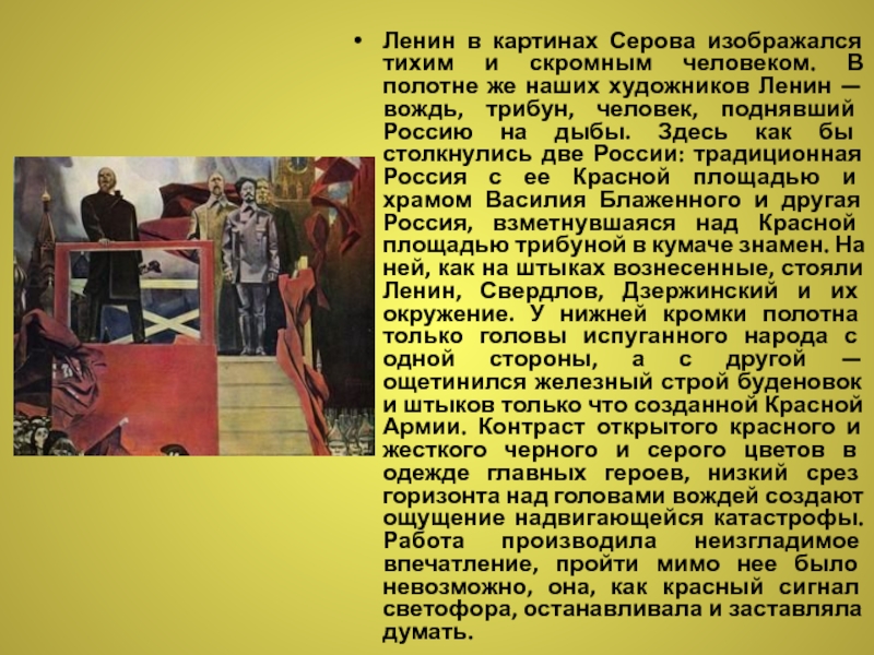 же наших художников Ленин — вождь, трибун, человек, поднявший Россию на дыбы. Здесь как бы столкнулись две России: традиционная Россия с ее Красной площадью и храмом Василия Блаженного и другая Россия, взметнувшаяся над Красной площадью трибуной в кумаче знамен. На ней, как на штыках вознесенные, стояли Ленин, Свердлов, Дзержинский и их окружение. У нижней кромки полотна только головы испуганного народа с одной стороны, а с другой — ощетинился железный строй буденовок и штыков только что созданной Красной Армии. Контраст открытого красного и жесткого черного и серого цветов в одежде главных героев, низкий срез горизонта над головами вождей создают ощущение надвигающейся катастрофы. Работа производила неизгладимое впечатление, пройти мимо нее было невозможно, она, как красный сигнал светофора, останавливала и заставляла думать.
