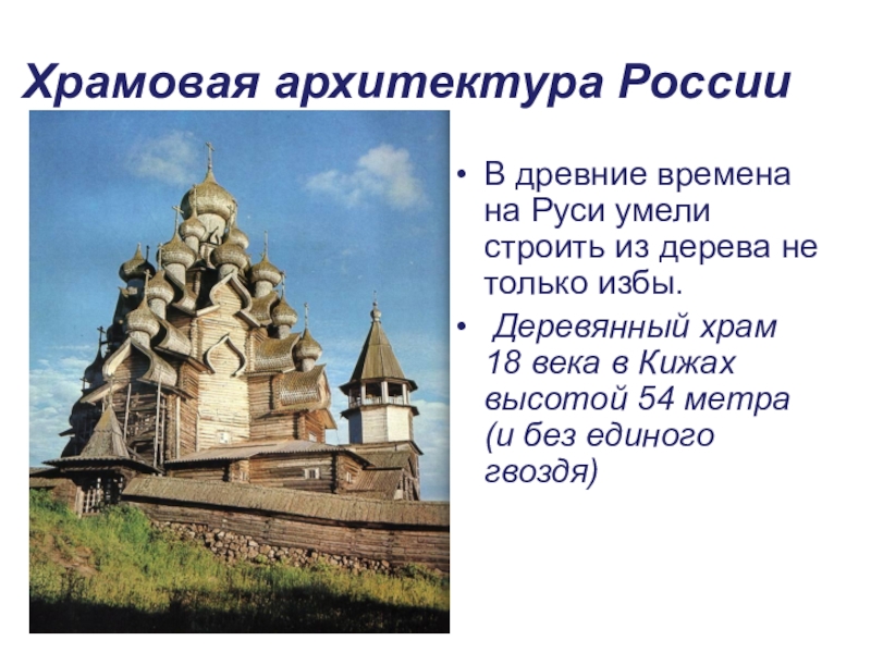 Храмовая архитектура России В древние времена на Руси умели строить из дерева не только избы. Деревянный храм