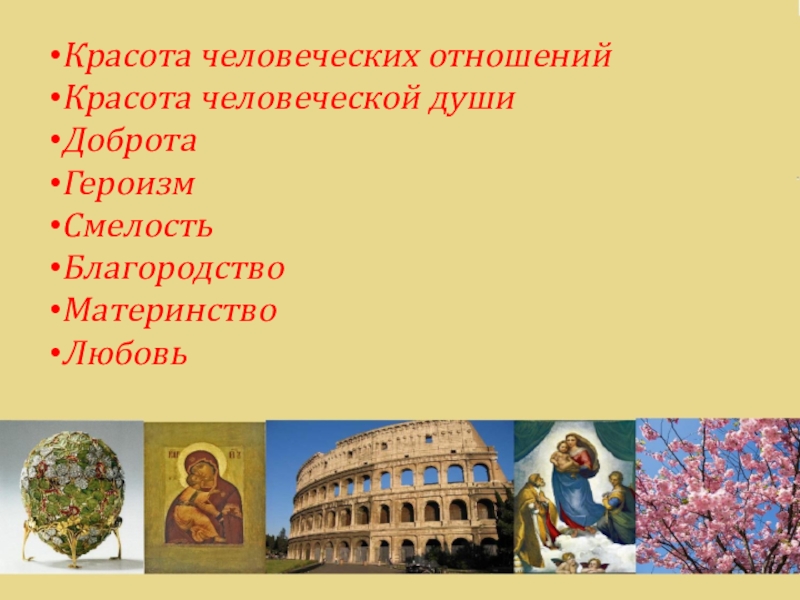 Красота человеческих отношенийКрасота человеческой душиДобротаГероизмСмелостьБлагородствоМатеринствоЛюбовь