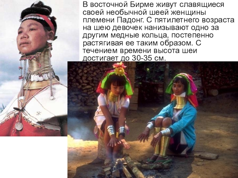 Слайд 27В восточной Бирме живут славящиеся своей необычной шеей женщины племени Падонг.