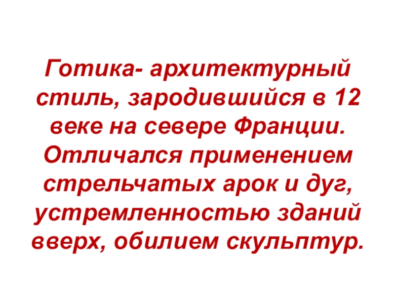 Готика- архитектурный стиль, зародившийся в 12 веке на севере Франции. Отличался применением стрельчатых арок и дуг, устремленностью
