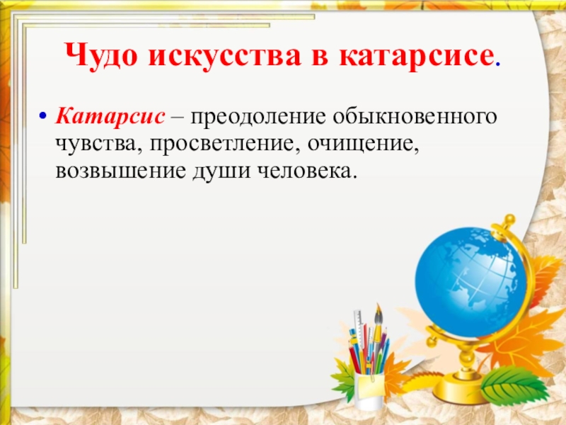 Чудо искусства в катарсисе.Катарсис – преодоление обыкновенного чувства, просветление, очищение, возвышение души человека.