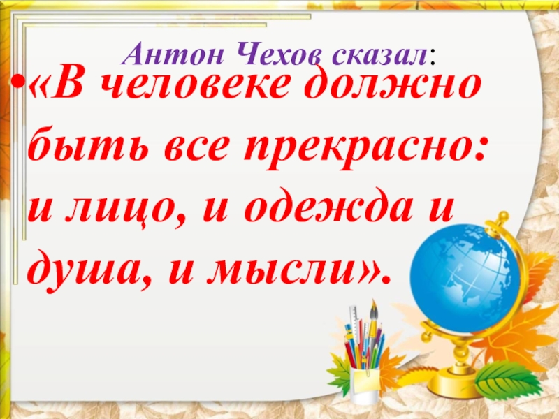 Антон Чехов сказал:«В человеке должно быть все прекрасно: и лицо, и одежда и душа, и мысли».