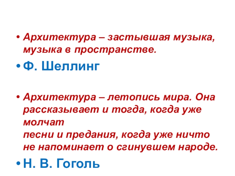 Архитектура – застывшая музыка, музыка в пространстве.Ф. ШеллингАрхитектура – летопись мира. Она рассказывает и тогда, когда уже