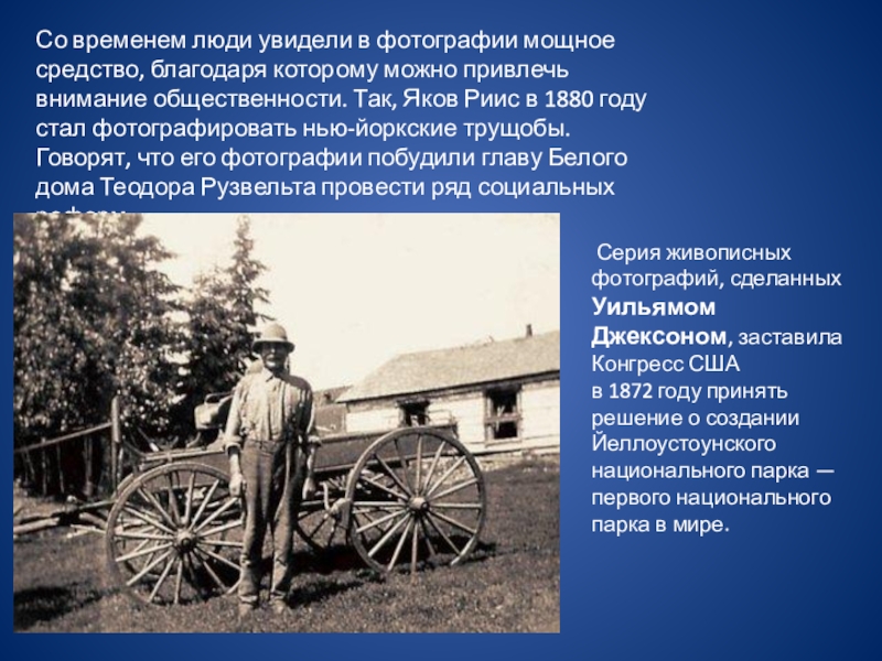 Серия живописных фотографий, сделанных Уильямом Джексоном, заставила Конгресс США в 1872 году принять решение о создании Йеллоустоунского национального парка — первого национального парка в мире.