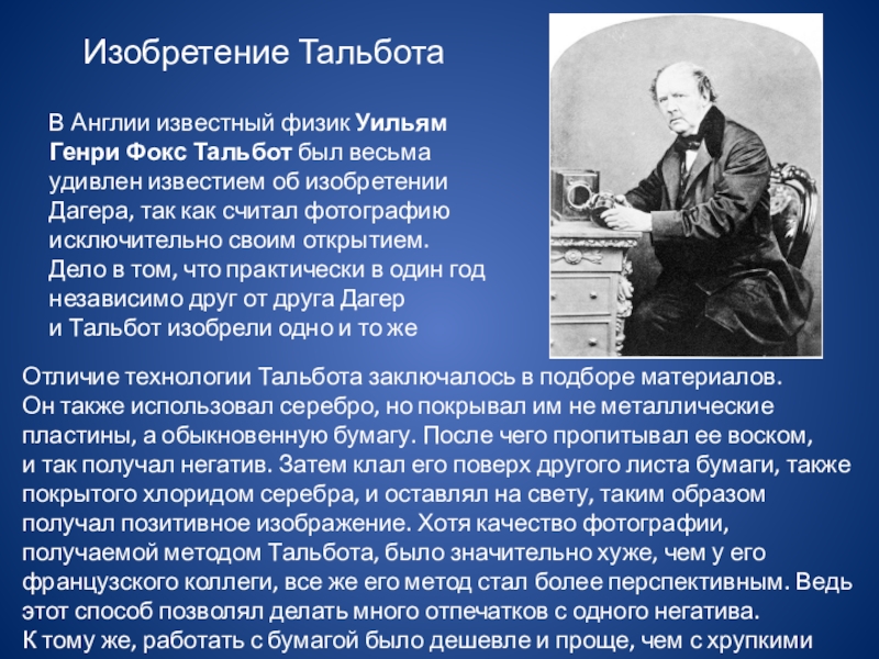 Отличие технологии Тальбота заключалось в подборе материалов. Он также использовал серебро, но покрывал им не металлические пластины, а обыкновенную бумагу. После чего пропитывал ее воском, и так получал негатив. Затем клал его поверх другого листа бумаги, также покрытого хлоридом серебра, и оставлял на свету, таким образом получал позитивное изображение. Хотя качество фотографии, получаемой методом Тальбота, было значительно хуже, чем у его французского коллеги, все же его метод стал более перспективным. Ведь этот способ позволял делать много отпечатков с одного негатива. К тому же, работать с бумагой было дешевле и проще, чем с хрупкими дагеротипами.