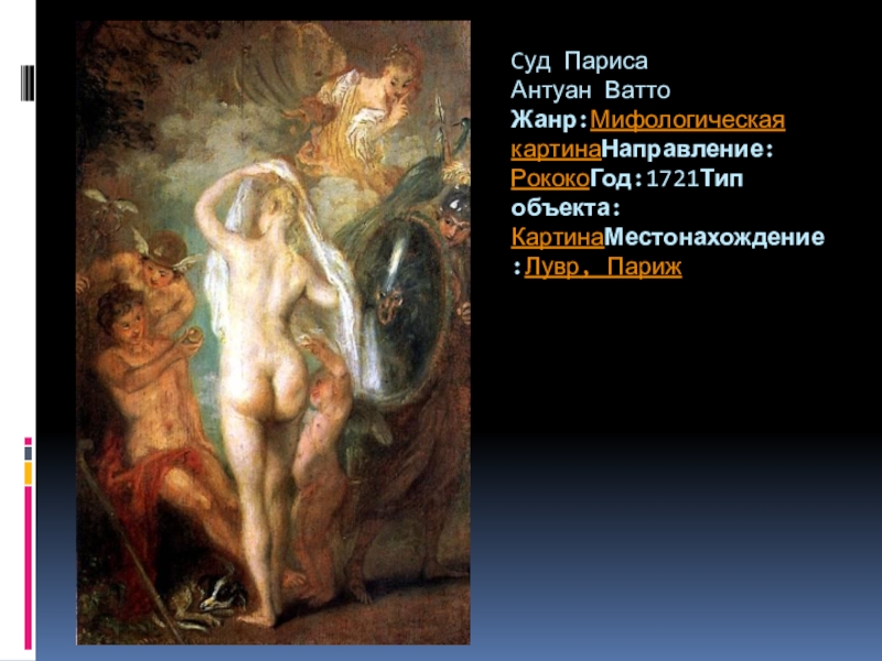 Слайд 11Cуд Париса Антуан Ватто Жанр:Мифологическая картинаНаправление:РококоГод:1721Тип объекта:КартинаМестонахождение:Лувр, Париж