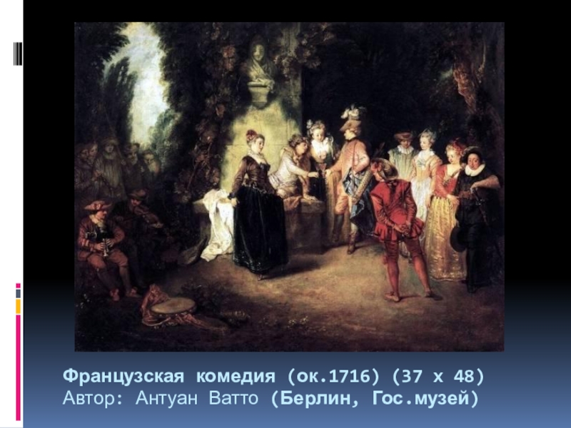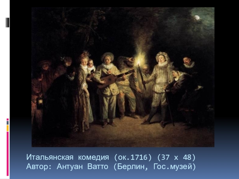 Слайд 17Итальянская комедия (ок.1716) (37 x 48) Автор: Антуан Ватто (Берлин, Гос.музей)