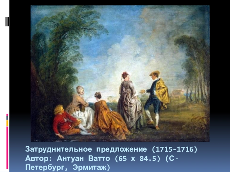 Слайд 7Затруднительное предложение (1715-1716) Автор: Антуан Ватто (65 х 84.5) (С-Петербург, Эрмитаж)