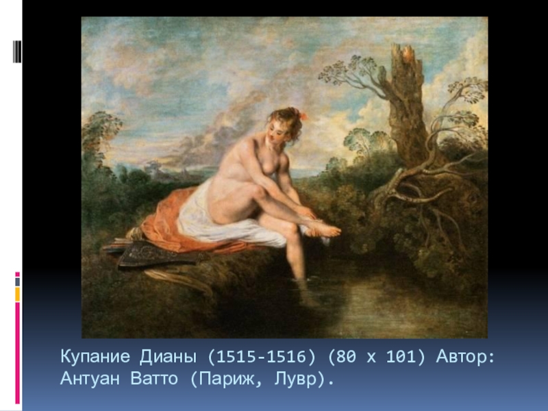 Слайд 13Купание Дианы (1515-1516) (80 х 101) Автор: Антуан Ватто (Париж, Лувр).