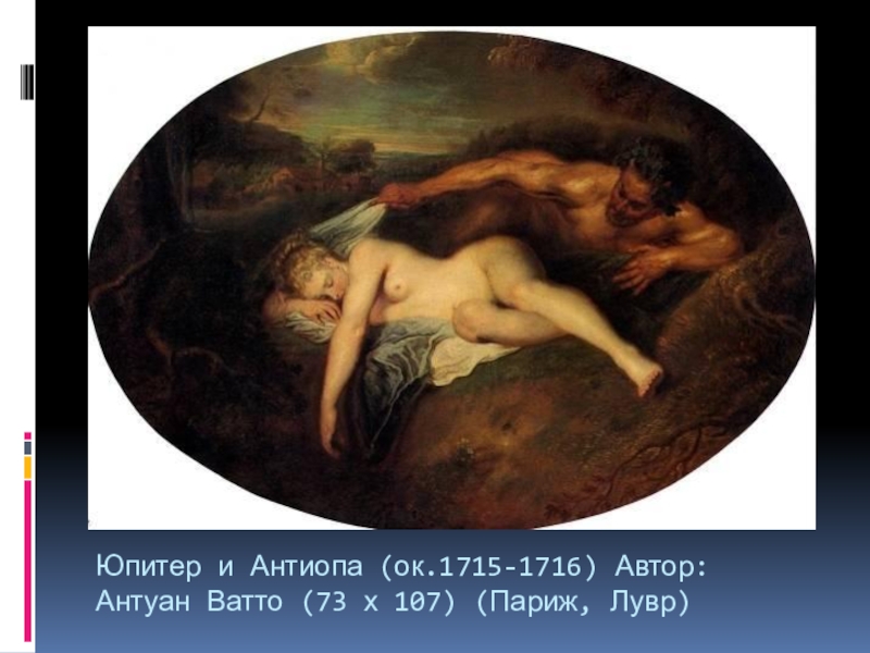 Слайд 14Юпитер и Антиопа (ок.1715-1716) Автор: Антуан Ватто (73 х 107) (Париж,
