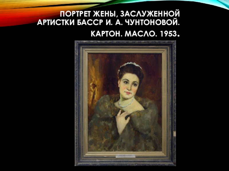 Слайд 17Портрет жены, заслуженной артистки БАССР И. А. Чунтоновой. Картон. Масло. 1953.