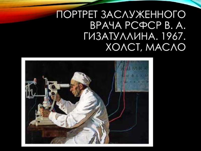 Слайд 3Портрет заслуженного врача РСФСР В. А. Гизатуллина. 1967. Холст, масло