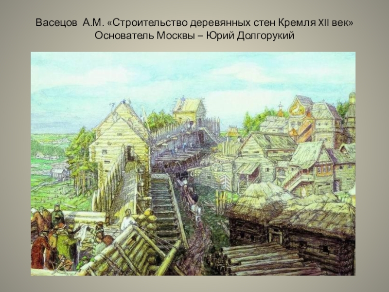 Слайд 4Васецов А.М. «Строительство деревянных стен Кремля XII век» Основатель Москвы – Юрий