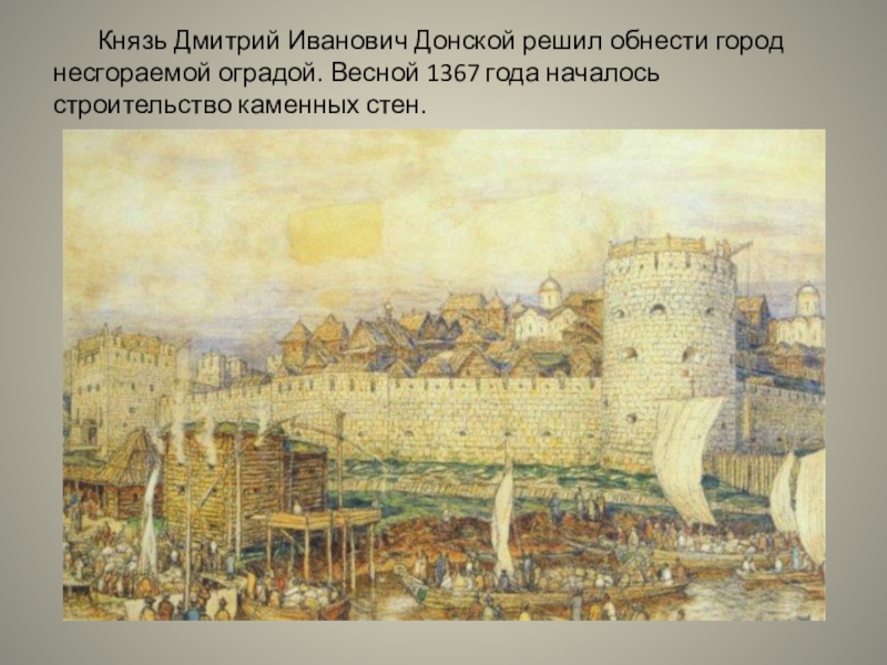 Слайд 6 Князь Дмитрий Иванович Донской решил обнести город несгораемой оградой. Весной 1367