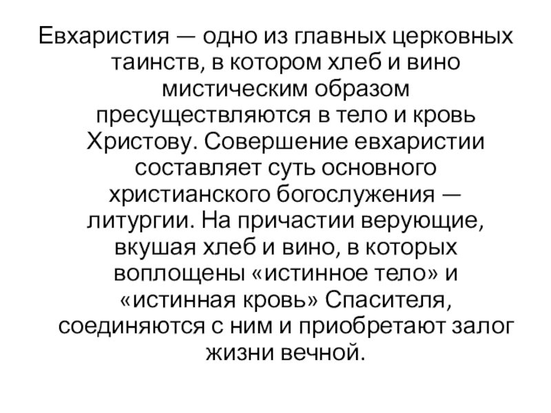 Слайд 28Евхаристия — одно из главных церковных таинств, в котором хлеб и вино