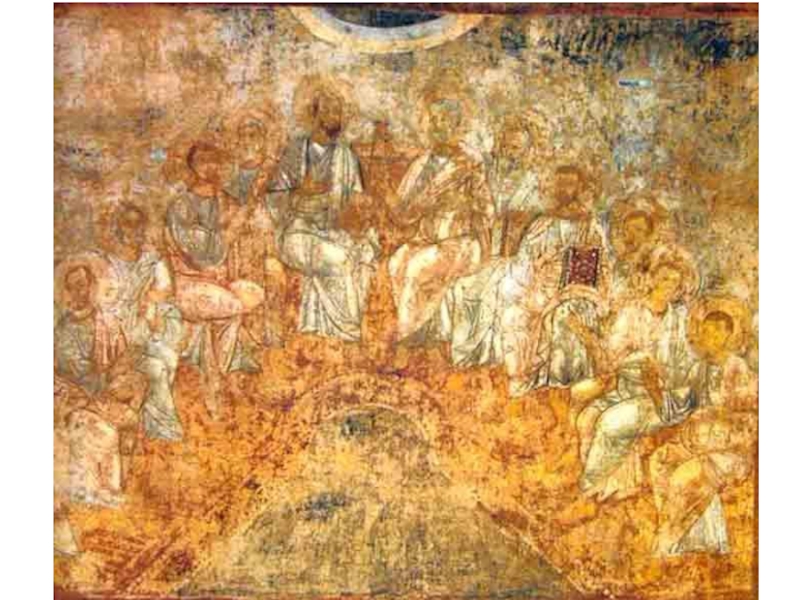 «Богоматери» в апсиде помещены традиционные для этой части храма «Евхаристия» и «Святительский чинНиже «Богоматери» в апсиде помещены традиционные для этой части храма «Евхаристия» и «Святительский чин», разделенные орнаментальным поясом. В сцене «Евхаристии» Христос, изображенный дважды, причащает подходящих к Нему учеников хлебом и вином. Композиция, поясняя суть таинства причастия, непосредственно была связана с происходившим в алтаре литургическим действом.