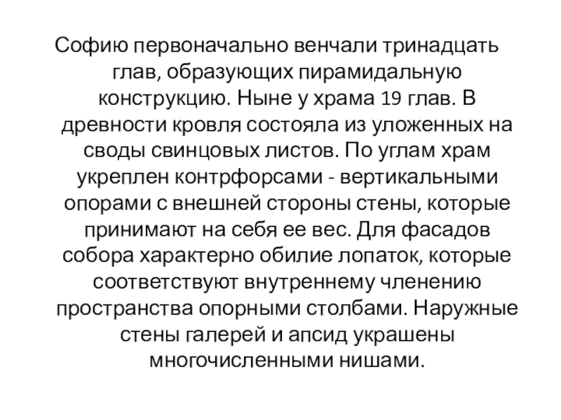 Слайд 5Софию первоначально венчали тринадцать глав, образующих пирамидальную конструкцию. Ныне у храма