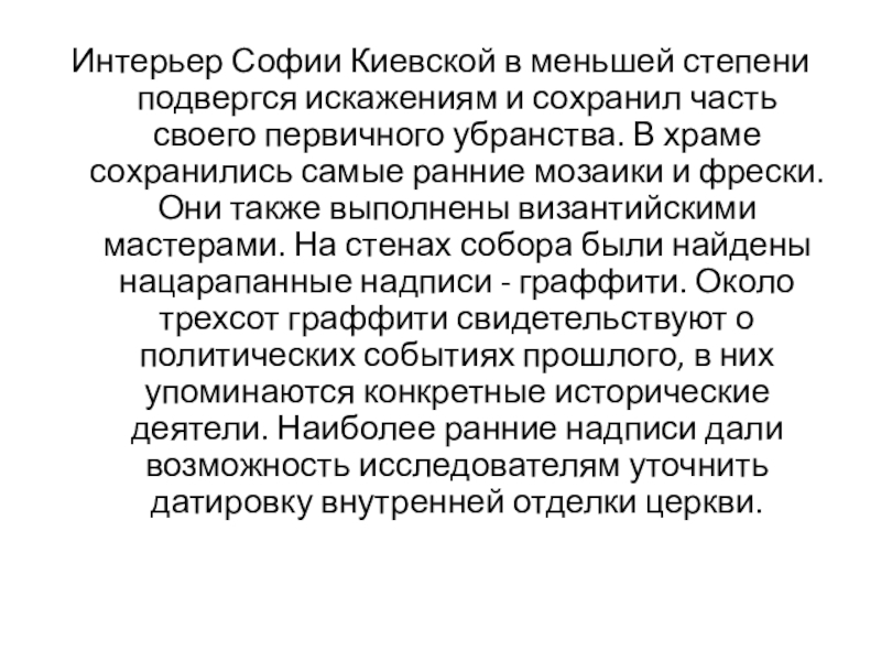 Слайд 6Интерьер Софии Киевской в меньшей степени подвергся искажениям и сохранил часть