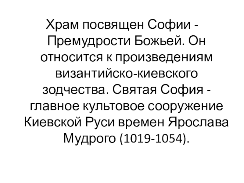 Слайд 3Храм посвящен Софии - Премудрости Божьей. Он относится к произведениям византийско-киевского
