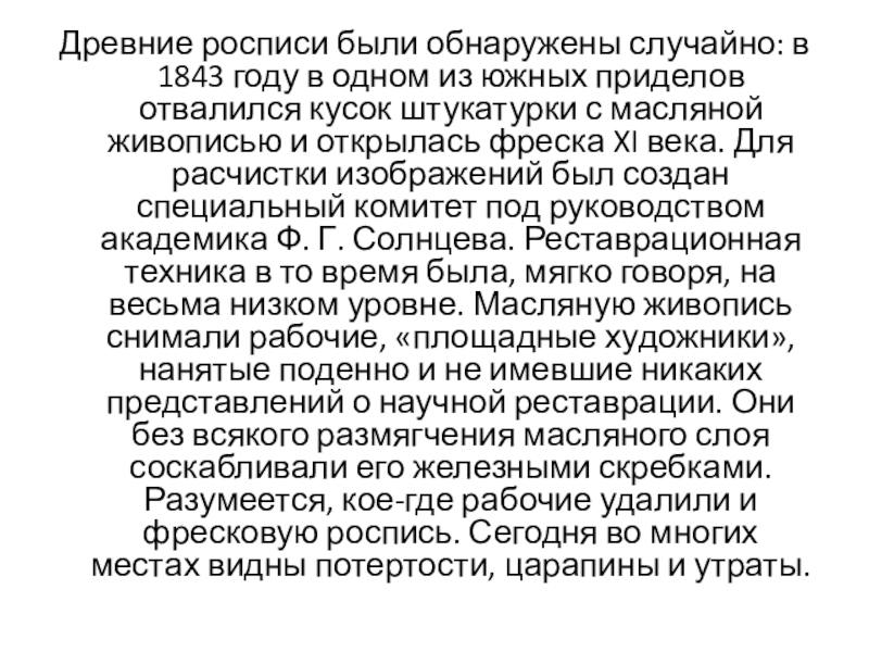 южных приделов отвалился кусок штукатурки с масляной живописью и открылась фреска XI века. Для расчистки изображений был создан специальный комитет под руководством академика Ф. Г. Солнцева. Реставрационная техника в то время была, мягко говоря, на весьма низком уровне. Масляную живопись снимали рабочие, «площадные художники», нанятые поденно и не имевшие никаких представлений о научной реставрации. Они без всякого размягчения масляного слоя соскабливали его железными скребками. Разумеется, кое-где рабочие удалили и фресковую роспись. Сегодня во многих местах видны потертости, царапины и утраты.