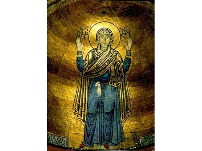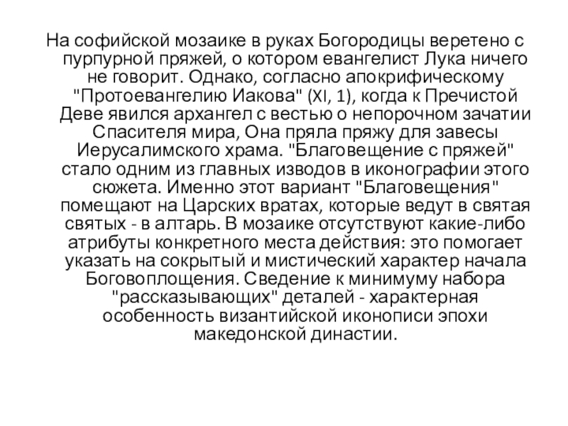 котором евангелист Лука ничего не говорит. Однако, согласно апокрифическому "Протоевангелию Иакова" (XI, 1), когда к Пречистой Деве явился архангел с вестью о непорочном зачатии Спасителя мира, Она пряла пряжу для завесы Иерусалимского храма. "Благовещение с пряжей" стало одним из главных изводов в иконографии этого сюжета. Именно этот вариант "Благовещения" помещают на Царских вратах, которые ведут в святая святых - в алтарь. В мозаике отсутствуют какие-либо атрибуты конкретного места действия: это помогает указать на сокрытый и мистический характер начала Боговоплощения. Сведение к минимуму набора "рассказывающих" деталей - характерная особенность византийской иконописи эпохи македонской династии.