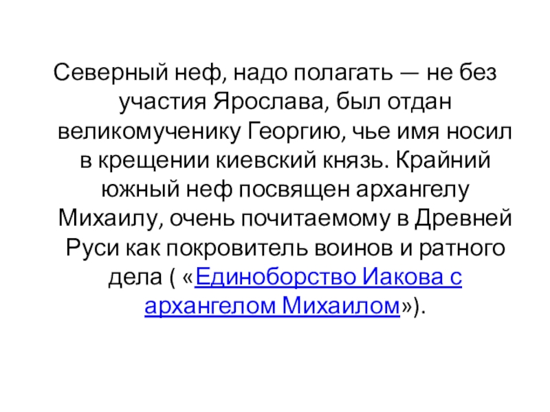 Слайд 44Северный неф, надо полагать — не без участия Ярослава, был отдан великомученику