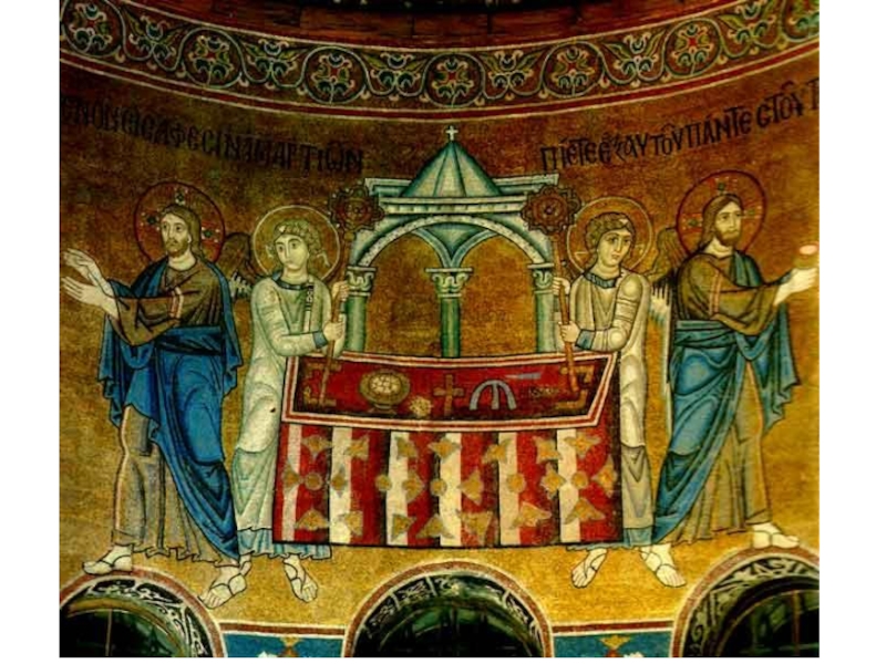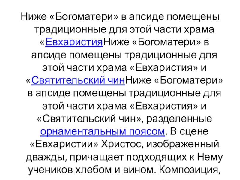 Слайд 23Ниже «Богоматери» в апсиде помещены традиционные для этой части храма «ЕвхаристияНиже