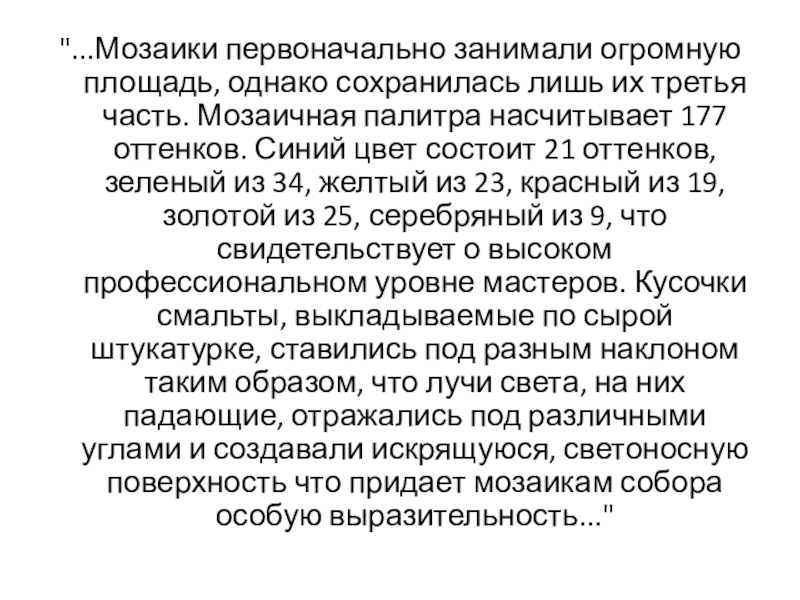 Мозаичная палитра насчитывает 177 оттенков. Синий цвет состоит 21 оттенков, зеленый из 34, желтый из 23, красный из 19, золотой из 25, серебряный из 9, что свидетельствует о высоком профессиональном уровне мастеров. Кусочки смальты, выкладываемые по сырой штукатурке, ставились под разным наклоном таким образом, что лучи света, на них падающие, отражались под различными углами и создавали искрящуюся, светоносную поверхность что придает мозаикам собора особую выразительность..."