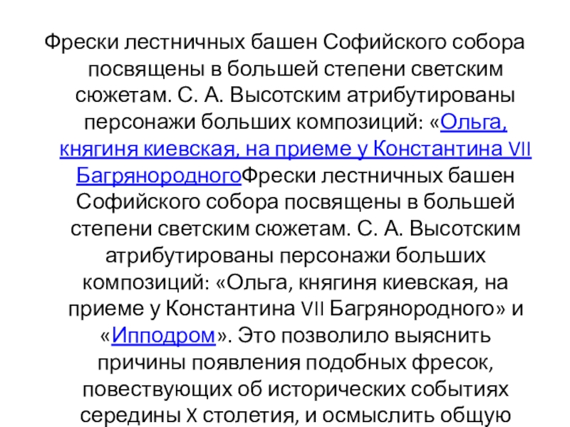 С. А. Высотским атрибутированы персонажи больших композиций: «Ольга, княгиня киевская, на приеме у Константина VII БагрянородногоФрески лестничных башен Софийского собора посвящены в большей степени светским сюжетам. С. А. Высотским атрибутированы персонажи больших композиций: «Ольга, княгиня киевская, на приеме у Константина VII Багрянородного» и «Ипподром». Это позволило выяснить причины появления подобных фресок, повествующих об исторических событиях середины X столетия, и осмыслить общую концепцию росписи башен.