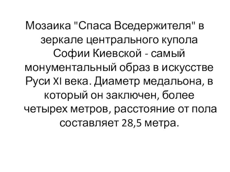 монументальный образ в искусстве Руси XI века. Диаметр медальона, в который он заключен, более четырех метров, расстояние от пола составляет 28,5 метра.