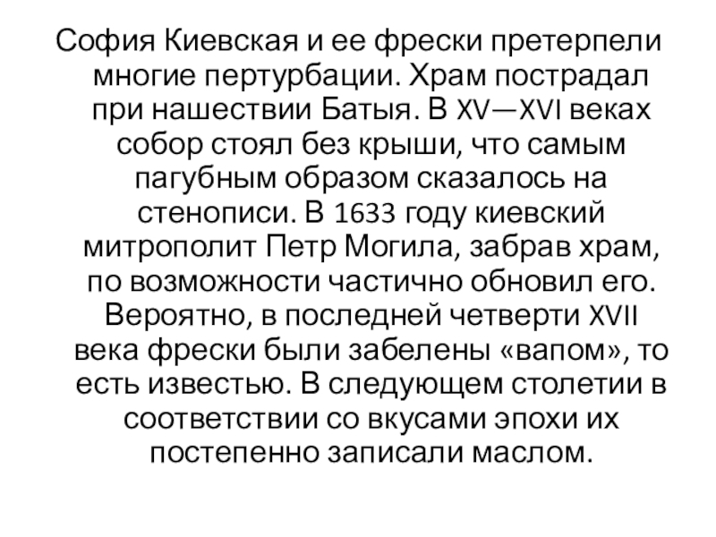 нашествии Батыя. В XV—XVI веках собор стоял без крыши, что самым пагубным образом сказалось на стенописи. В 1633 году киевский митрополит Петр Могила, забрав храм, по возможности частично обновил его. Вероятно, в последней четверти XVII века фрески были забелены «вапом», то есть известью. В следующем столетии в соответствии со вкусами эпохи их постепенно записали маслом.