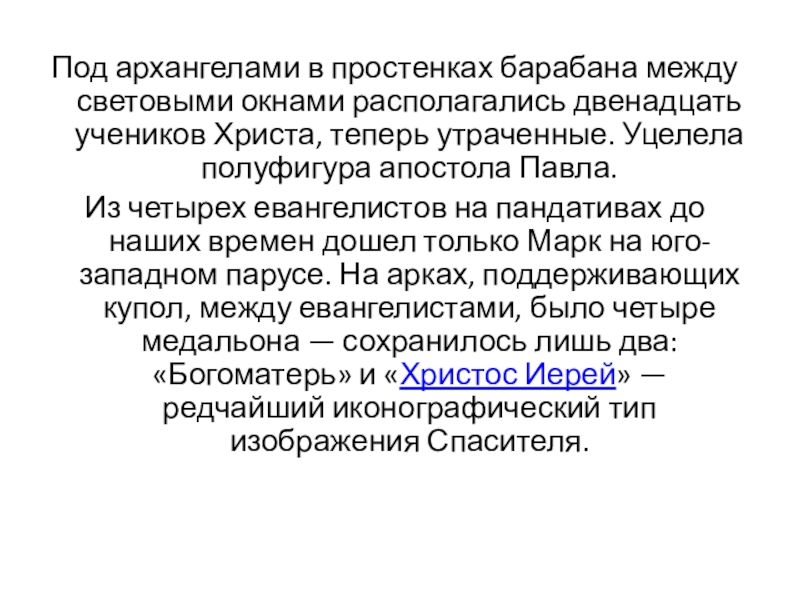 Слайд 18Под архангелами в простенках барабана между световыми окнами располагались двенадцать учеников