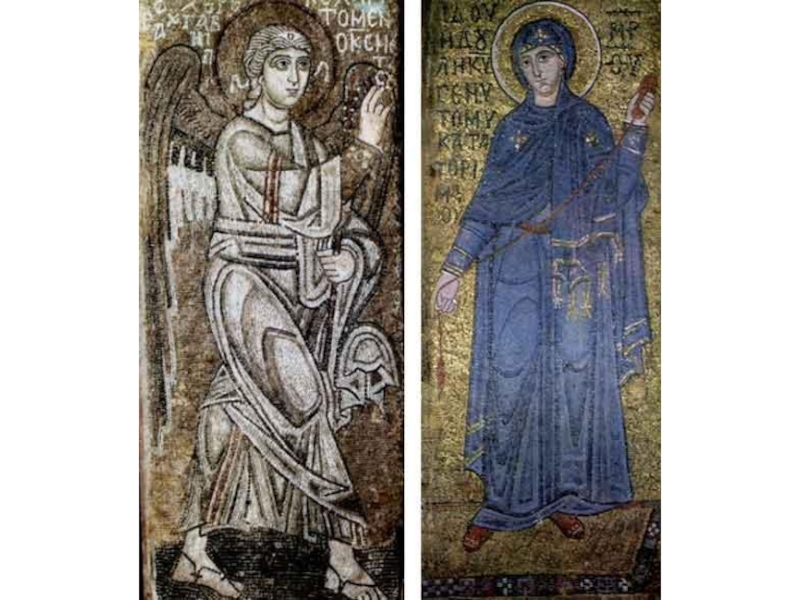 Фигуры архангела и Девы Марии выполняли разные мозаичисты. Гавриил, в отличие от Богоматери, массивен и грузен, а складки его одеяний почти прямоугольны и ломки.