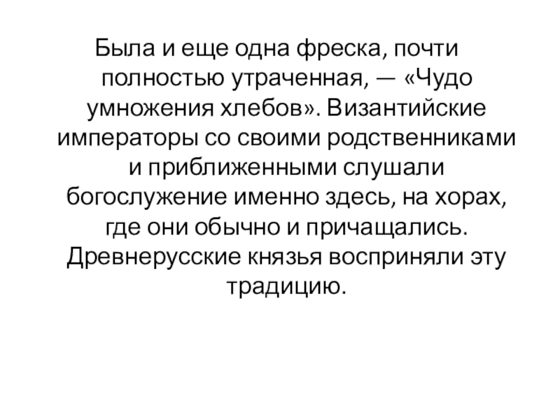 Византийские императоры со своими родственниками и приближенными слушали богослужение именно здесь, на хорах, где они обычно и причащались. Древнерусские князья восприняли эту традицию.