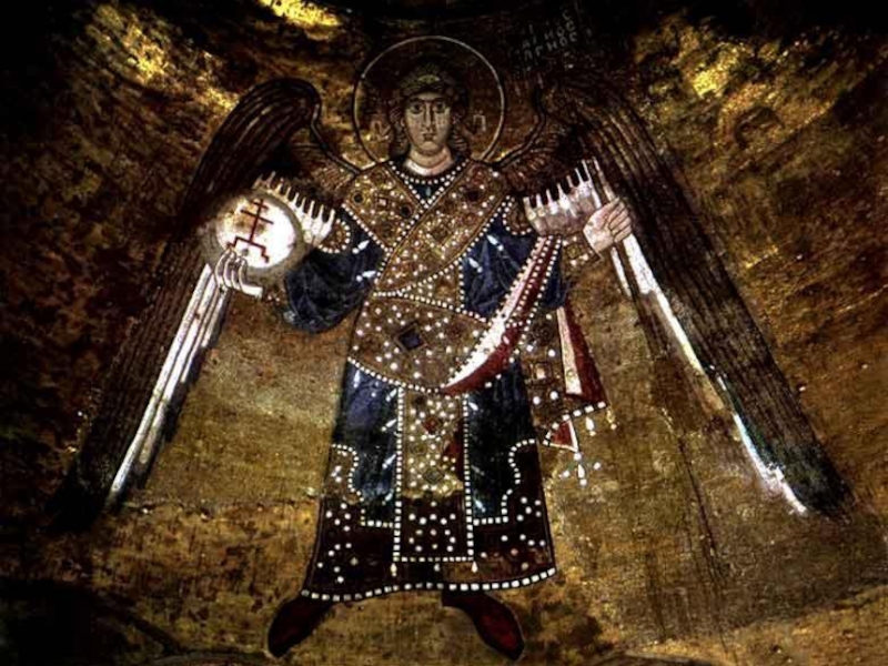 стражей, из которых сохранилась, и то частично, лишь одна мозаичная фигура архангела в голубом, расшитом золотом хитоне с лором, широкой длинной полосой ткани, украшенной драгоценными камнями. Остальные три в 1884 году были написаны масляными красками по инициативе А. В. Прахова художниками Зазулиным и Гайдуком.