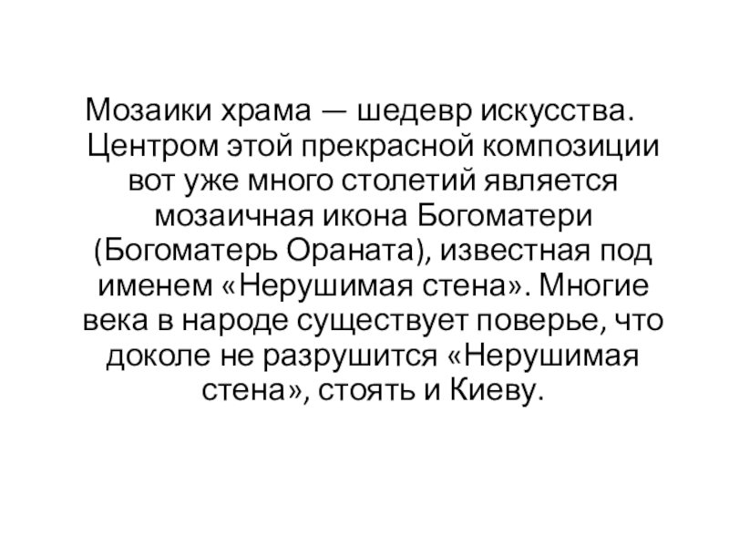 много столетий является мозаичная икона Богоматери (Богоматерь Ораната), известная под именем «Нерушимая стена». Многие века в народе существует поверье, что доколе не разрушится «Нерушимая стена», стоять и Киеву.