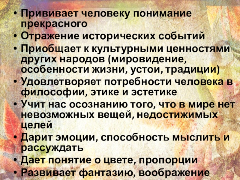 Прививает человеку понимание прекрасногоОтражение исторических событийПриобщает к культурными ценностями других народов (мировидение, особенности жизни, устои, традиции)Удовлетворяет потребности человека в философии, этике и эстетикеУчит нас осознанию того, что в мире нет невозможных вещей, недостижимых целейДарит эмоции, способность
