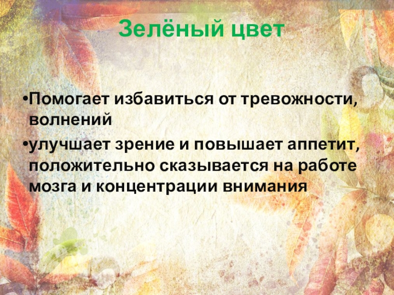 Зелёный цветПомогает избавиться от тревожности, волненийулучшает зрение и повышает аппетит, положительно сказывается на работе мозга и концентрации