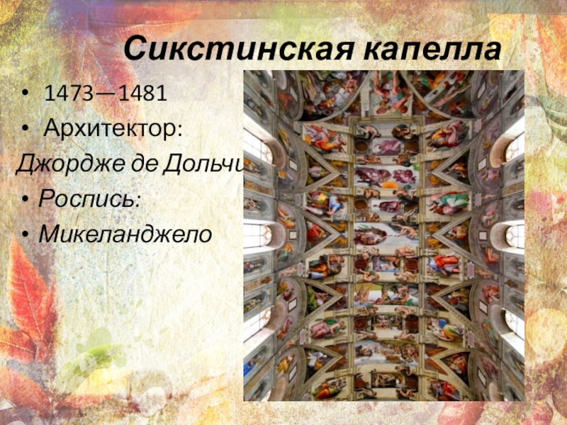 Сикстинская капелла 1473—1481  Архитектор: Джордже де ДольчиРоспись:Микеланджело