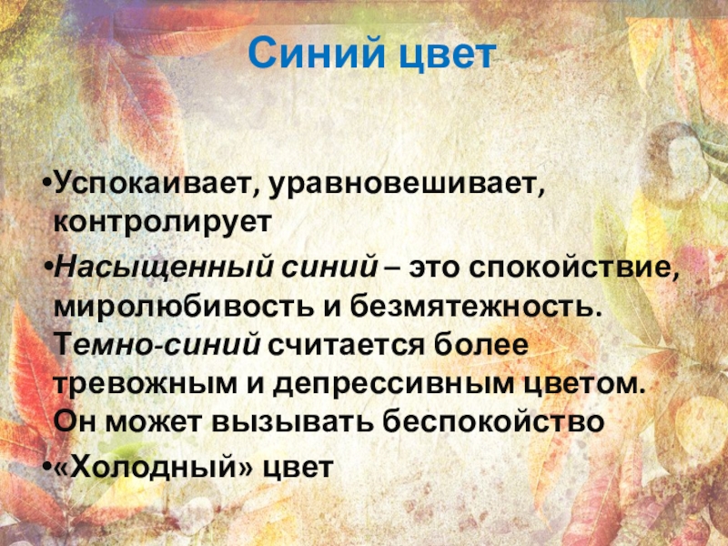 Синий цветУспокаивает, уравновешивает, контролируетНасыщенный синий – это спокойствие, миролюбивость и безмятежность. Темно-синий считается более тревожным и депрессивным