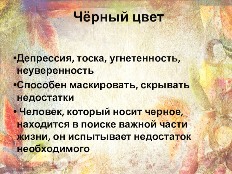 Чёрный цветДепрессия, тоска, угнетенность, неуверенностьСпособен маскировать, скрывать недостатки Человек, который носит черное, находится в поиске важной части