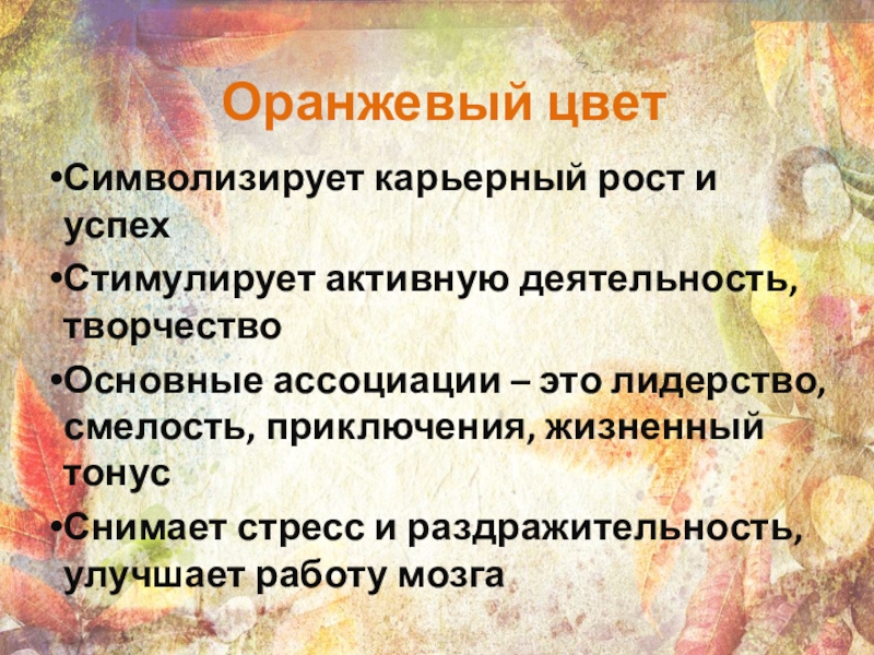 Оранжевый цветСимволизирует карьерный рост и успехСтимулирует активную деятельность, творчествоОсновные ассоциации – это лидерство, смелость, приключения, жизненный тонусСнимает