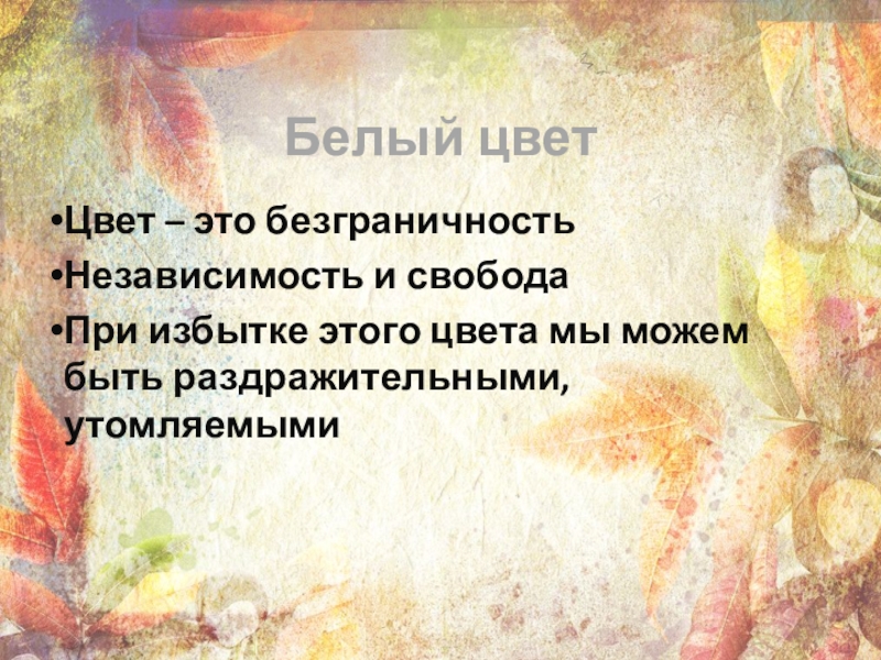 Белый цветЦвет – это безграничностьНезависимость и свободаПри избытке этого цвета мы можем быть раздражительными, утомляемыми